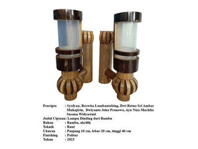 Akrilik dipilih sebagai material komplementer yang berfungsi sebagai diffuser cahaya sekaligus emen estetika modern. Sifat akrilik yang transparan memungkinkan distribusi cahaya yang optimal sekaligus mempertajam tampilan visual serat dan kontras warna bambu ketika diterangi. ari segi manfaat, karya ini berfungsi sebagai sumber pencahayaan ambient yang menciptakan atmosfer hangat dan nyaman, sekaligus berperan sebagai elemen dekoratif dinding yang artistik. nishing dengan politur tidak hanya meningkatkan daya tahan material bambu, tetapi juga empertegas keunikan serat alaminya.
